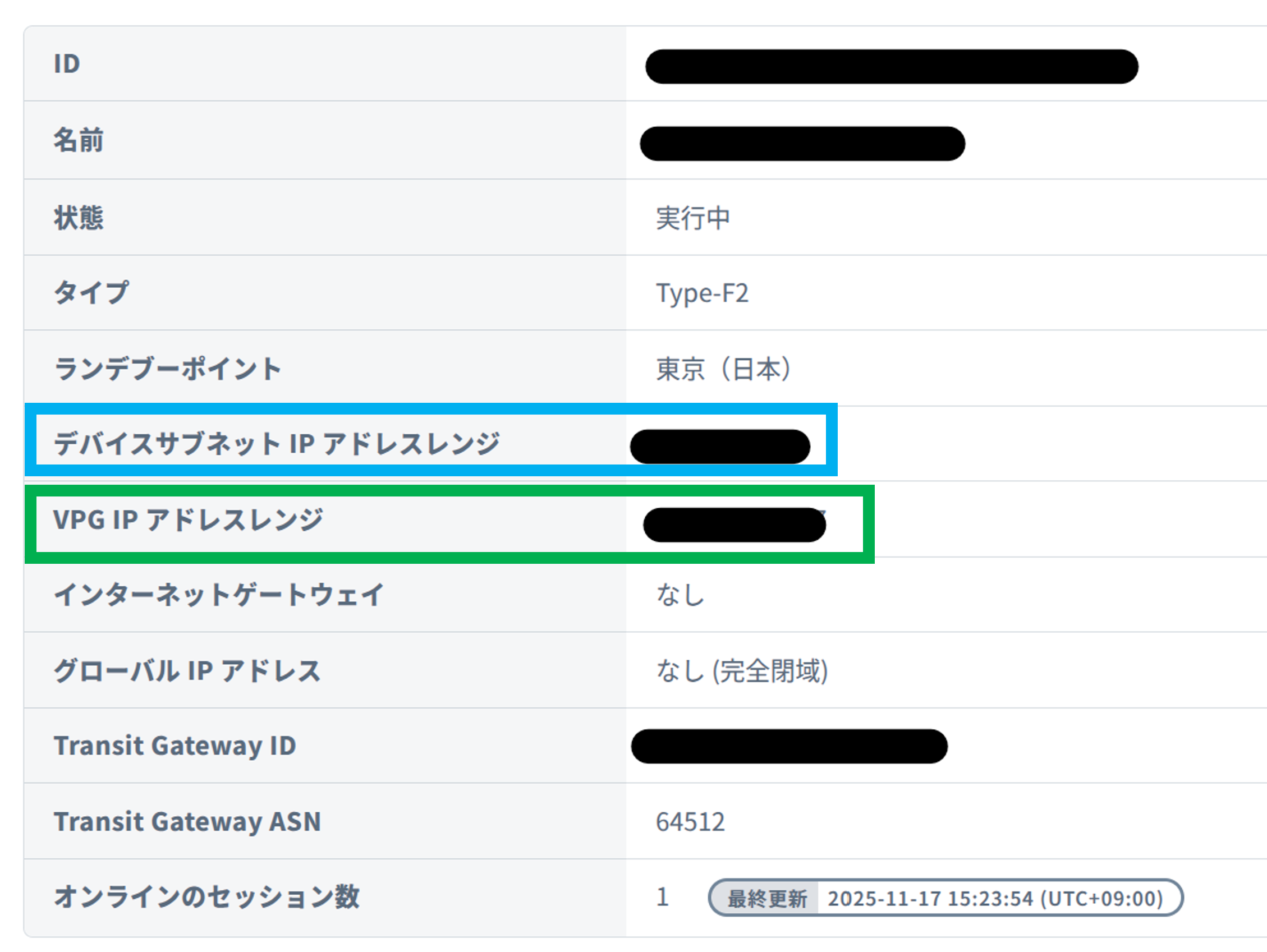 項目 説明 ステップ 2: VPG を作成する で作成した VPG ID。VPG ID は、SORACOM ユーザーコンソールの VPG 一覧画面で確認できます。