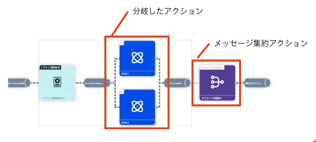 メッセージ集約アクションは、アクションを分岐した場合や配列データを分割して、新規イベントとして送信するを使用して処理を分岐させた場合に、分岐した処理を集約します。