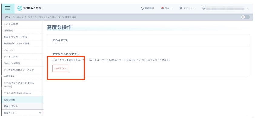 ソラカメで利用している ATOM アプリのアクセストークンを強制的に無効化し、アカウントのすべてのユーザーを ATOM アプリからログアウトさせることができます。ルートユーザーと SAM ユーザーが利用している端末から ATOM アプリにアクセスできなくなったときや、別の管理者に SAM ユーザーを引き継ぐときなどに利用します。