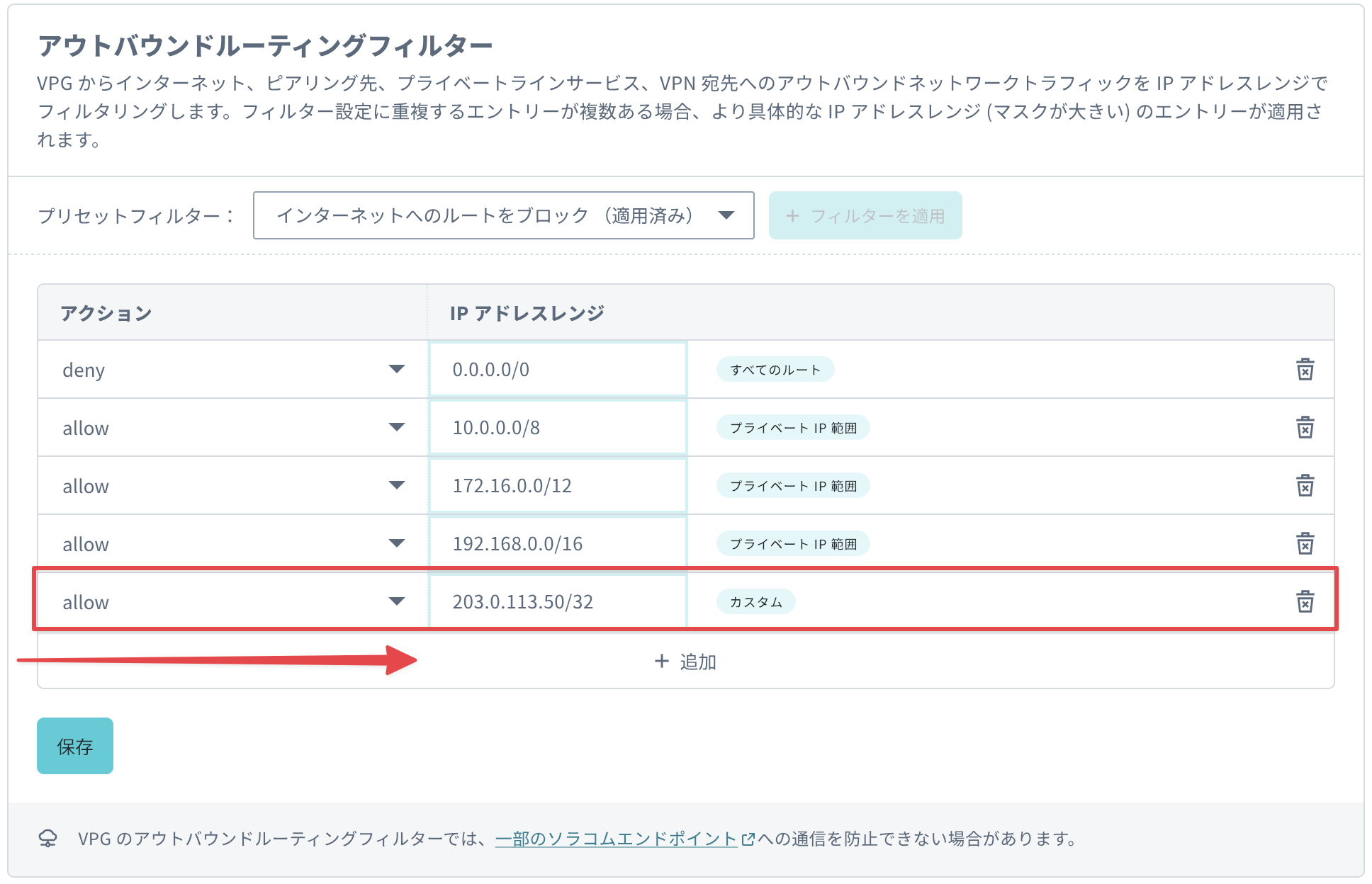 203.0.113.50) への通信のみ追加で許可します。をクリックし、以下のエントリを入力します。