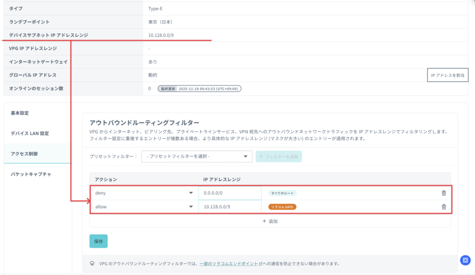 アウトバウンドルーティングフィルターで にチェックを入れても、Beam、Funnel、Funk を利用して、インターネットにあるサーバーや、パブリッククラウド、FaaS にデータを転送できます。あらためて Beam、Funnel、Funk の IP アドレスレンジを指定して許可する必要はありません。詳しくは、VPG に所属するデバイスの通信先を制限する機能 を参照してください。