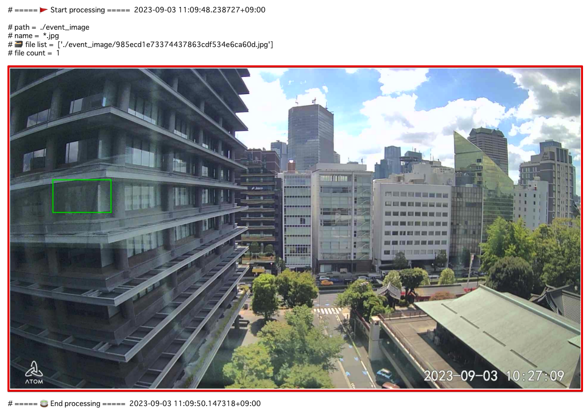 前のステップで選択したイベントの動画を、ストリーミング再生 します。再生するイベント動画の長さ分「動画のエクスポート可能時間」が消費されます。Colab 上で動画を再生することで、この後のステップで検出できる対象物があるかどうかを確認します。