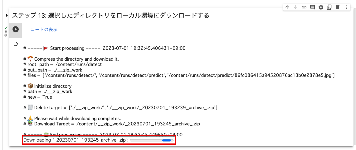 _20230701_193245_archive_.zipという zip 形式のファイルがローカルにダウンロードされます。Colab 内のファイルとローカル環境のファイルを比較してください