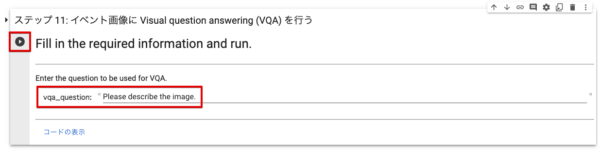 項目 説明 画像に関する質問を 英語で入力します。サンプルコードの のコードセルにマウスポインターを合わせて クリックします。