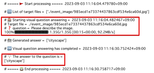 イベント画像に VQA を行います。VQA は、対象の画像についての質問を自然言語で入力すると、AI が画像の内容を読み取って質問に対して文字列で返答を行います。