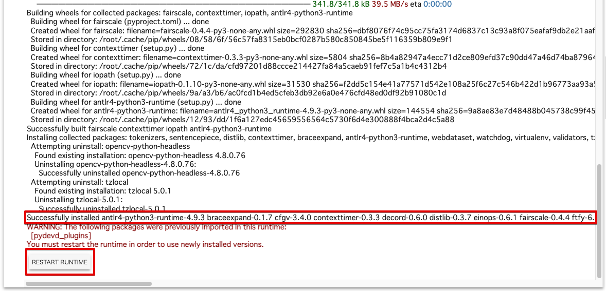 You must restart the runtime in order to use newly installed versions.のような、ランタイムの再起動を求めるメッセージも表示されます。