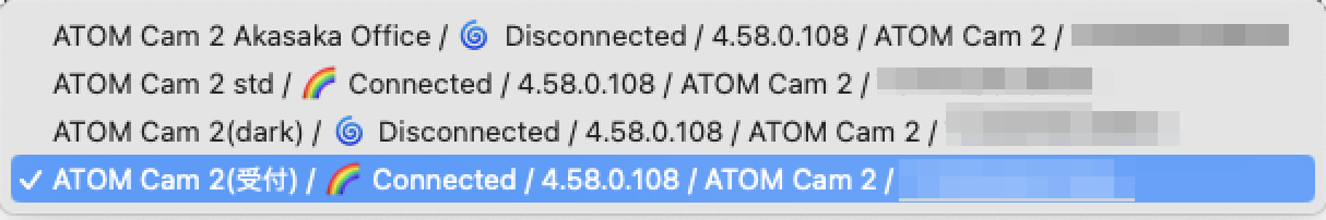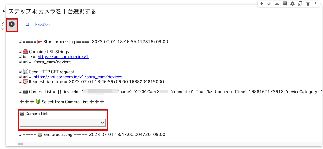ソラカメ対応カメラの一覧を取得し、そこからソラカメ対応カメラを 1 台選択します。このステップ以降では、ここで選択したソラカメ対応カメラがクラウドに保存した動画や画像に対して、API で操作を行います。