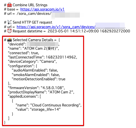 SoraCam:getSoraCamDevice API | ソラカメ対応カメラの情報を取得する |