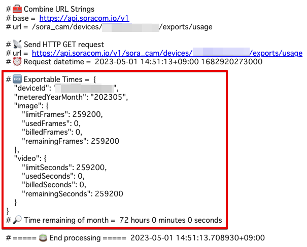SoraCam:getSoraCamDeviceExportUsage API | ソラカメ対応カメラの静止画のエクスポート可能枚数や録画映像のエクスポート可能時間を取得する |
