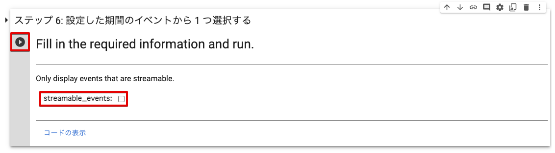 項目 説明 ストリーミング再生できるイベントのみを表示する場合は、チェックを入れます。 サンプルコードの のコードセルにマウスポインターを合わせて クリックします。