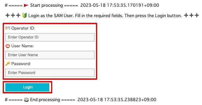 手順 2 の で「SAM User」を選択した場合は、SAM ユーザーが所属するオペレーターのオペレーター ID、SAM ユーザー名、パスワードを入力します。