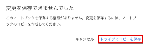 GitHub から実行したサンプルコードを修正して保存する際、「変更を保存できませんでした」と表示されることがあります。保存する場合には表示された内容を確認して、 をクリックしてください。ログインしている Google アカウントの Google ドライブ にノートブックのコピーが保存されます。