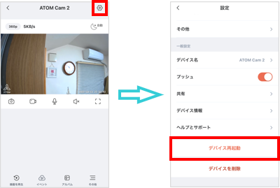 ATOM アプリに「{デバイス名}がオフラインになりました。カメラの再起動が必要です。」と表示された場合は、ソラカメ対応カメラを再起動します。